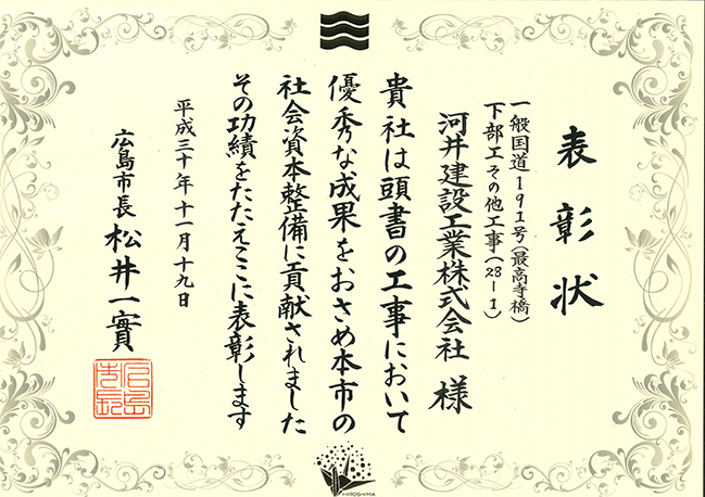 「平成30年度広島県優良建設業者」「平成30年度広島市優良建設工事」として表彰されました。2018.11.27