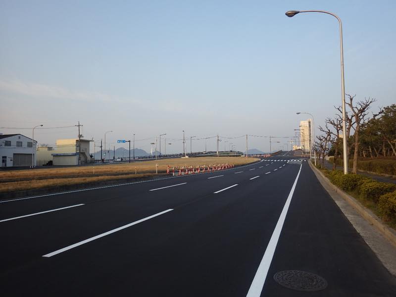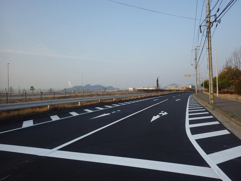 | 工事内容 | 舗装工(車道部)A=6,430㎡、舗装工(歩道部)A=2,420㎡、区画線工 L=2,393m、防護柵工 L=1,416m |